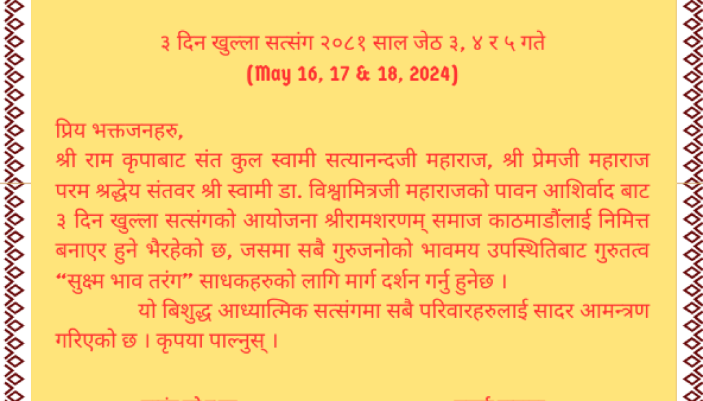 श्री राम कृपाबाट संत कुल स्वामी सत्यानन्दजी महाराज, श्री प्रेमजी महाराज परम श्रद्धेय संतवर श्री स्वामी डा. विश्वामित्रजी महाराजको पावन आशिर्वाद बाट ३ दिन खुल्ला सत्संगको आयोजना श्रीरामशरणम् समाज काठमाडौंलाई निमित्त बनाएर हुने भैरहेको छ, जसमा सबै गुरुजनोको भावमय उपस्थितिबाट गुरुतत्व “सुक्ष्म भाव तरंग” साधकहरुको लागि मार्ग दर्शन गर्नु हुनेछ ।